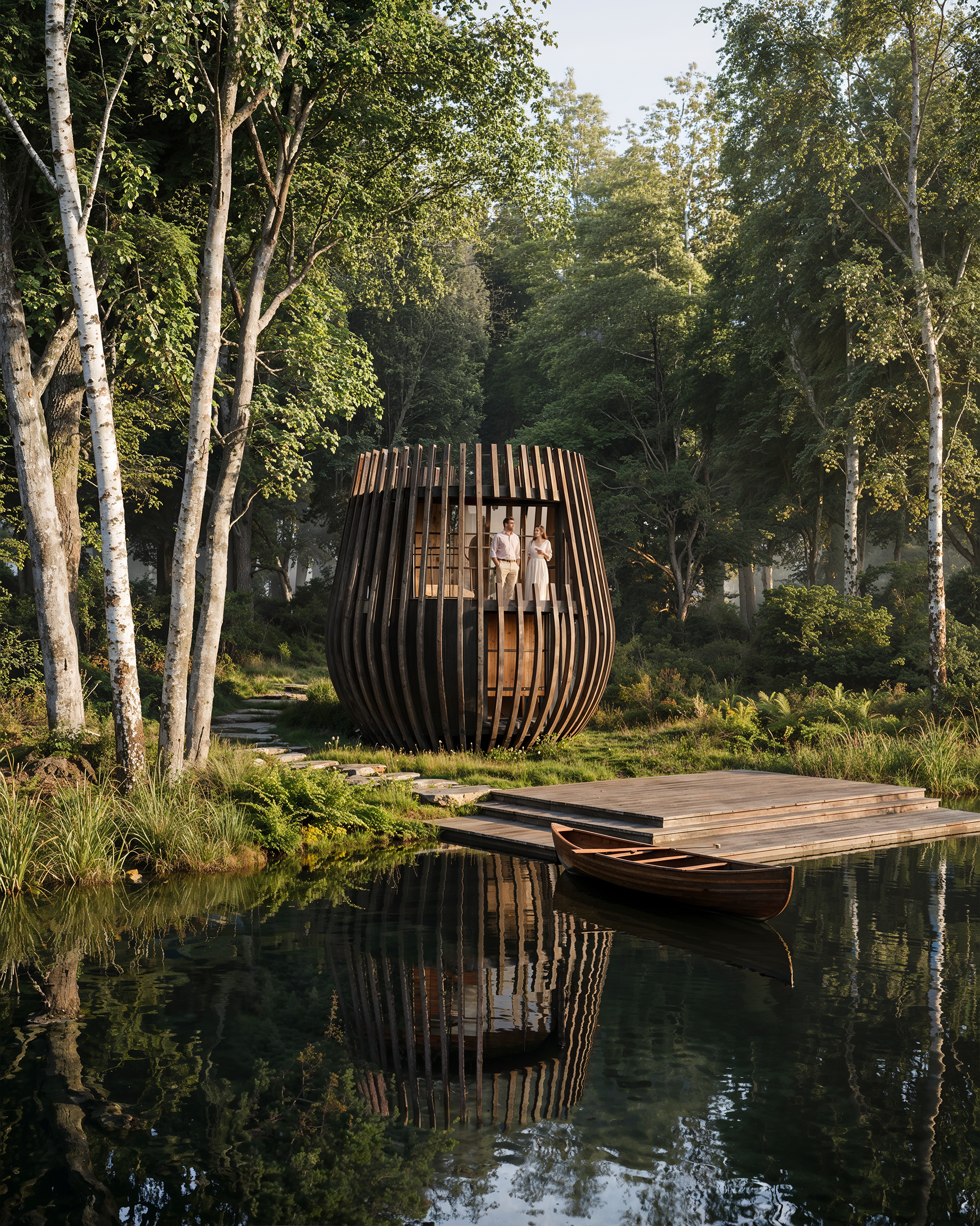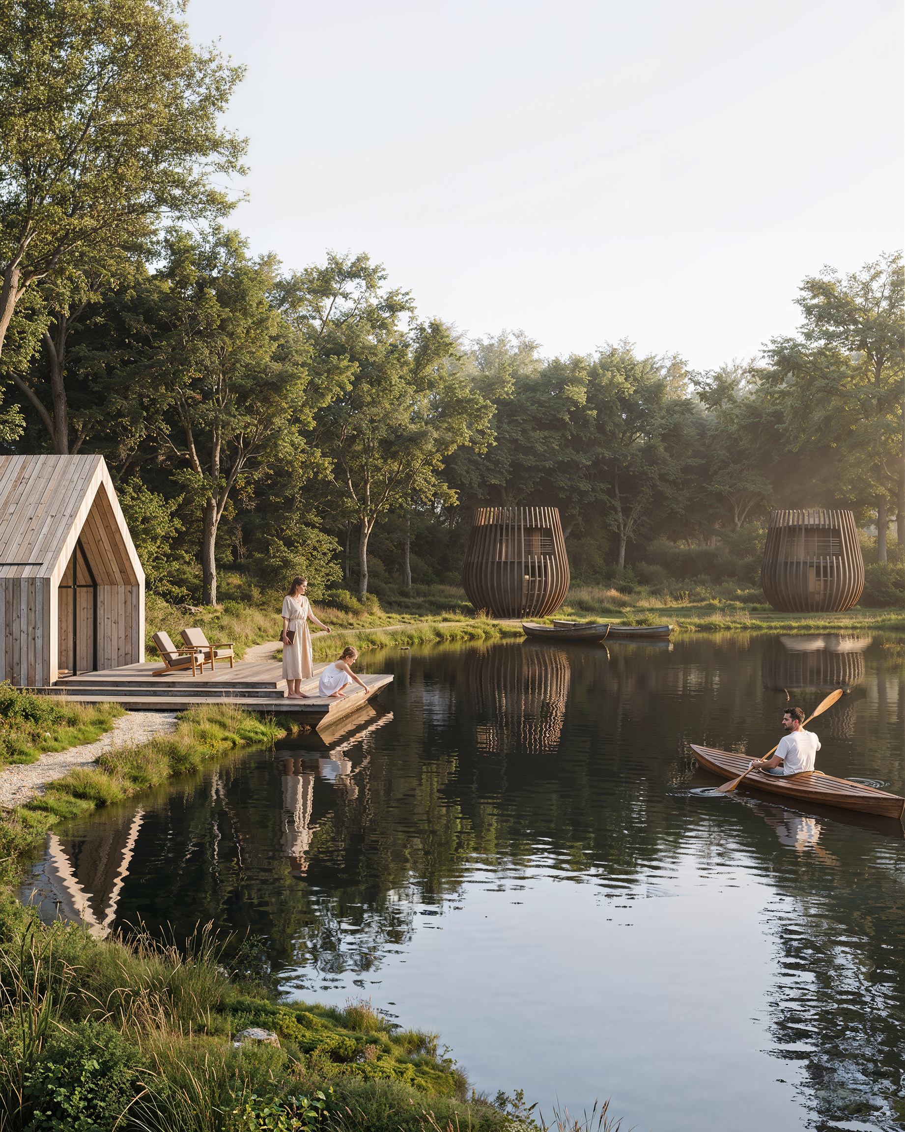 The site has been carefully organised to minimise the impact of the development on the broader landscape, with all units generally below the height of the dense trees that surround the 60-acre site. Future guests at Foxbridge will be able to choose from a range of stone and timber-panelled lodges designed in harmony with the local West Sussex vernacular, alongside a collection of Urban Blossom Poppy units, with curved timber structures designed to merge with the surrounding trees. Carefully positioned in response to the site’s topography, the units are oriented to frame expansive views across four newly formed ponds, which follow the natural contours of the former course’s greens.